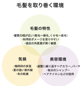 続いて、ヘアカラーやパーマ、アイロンなどの「美容習慣」が与えるダメージによる悩み。さらに、夏の強い紫外線や冬の乾燥によるパサつき、高温多湿によるうねりなど、同じ人でも「四季」によって悩みは変わります。